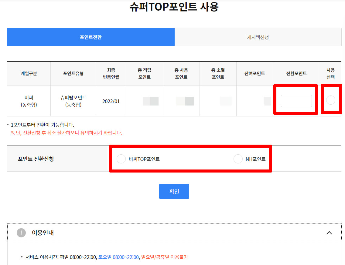 2) 농촌사랑포인트를 눌러서 슈퍼TOP 포인트로 바꿔주기