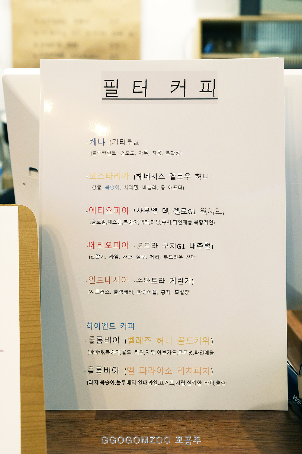 그리고 필터 커피의 경우에는 일곱 지역의 원두 중 선택이 가능했다.