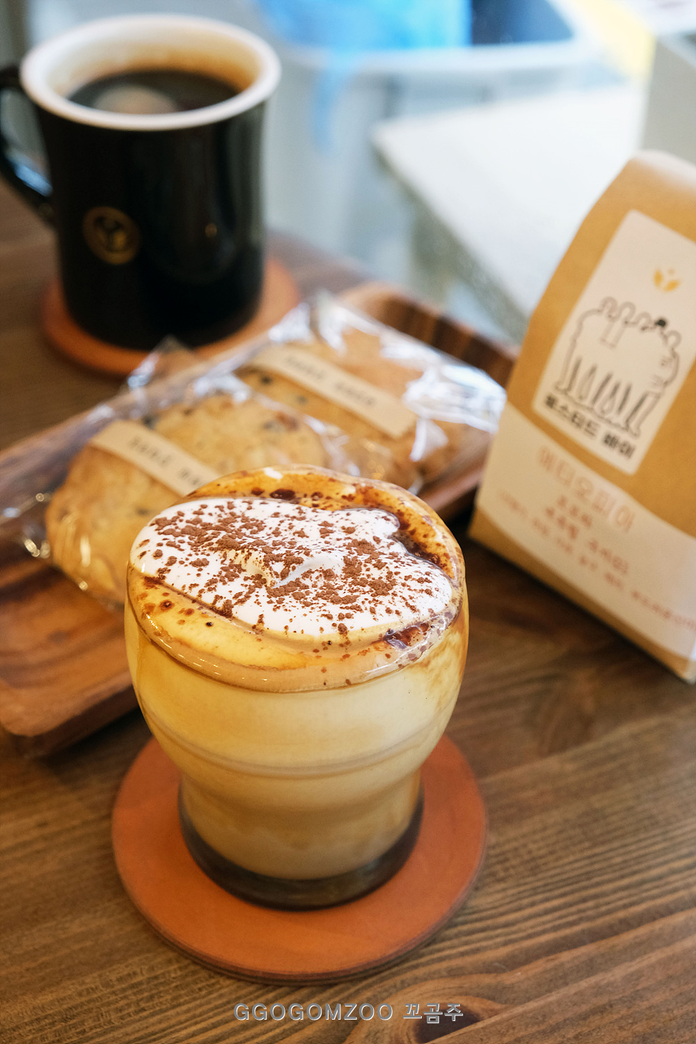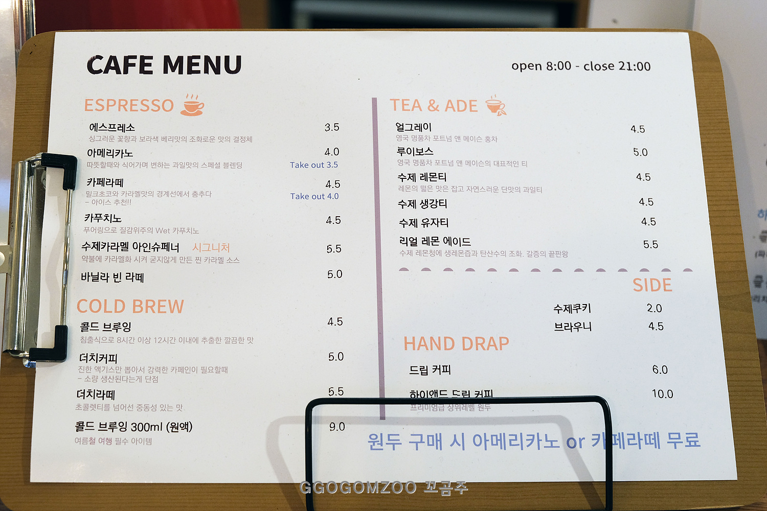 원두를 구매하면 아메리카노나 카페라테 중 한잔이 무료라서 에티오피아 모모라 구지G1(내추럴) 원두를 사면서 서비스로 받는 따듯한 아메리카노 한잔(만리 블렌드)에, 이곳의 시그니처라는 수제 캐러멜 아인슈페너를 한잔을 더 시켜 마시고 왔다.