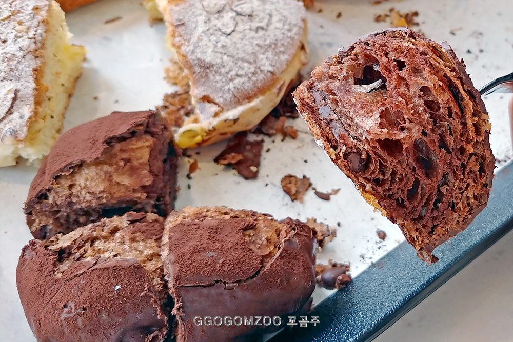 초콜릿 가득이지만 이 역시 많이 달지 않아서 먹기 괜찮았던 빵이다.